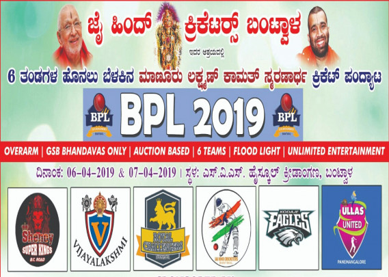 Jai Hind Cricketers Bantwal presents Bantwal Premier League 2019 to be held on 6th and 7th april at S.V.S High School, Bantwal.